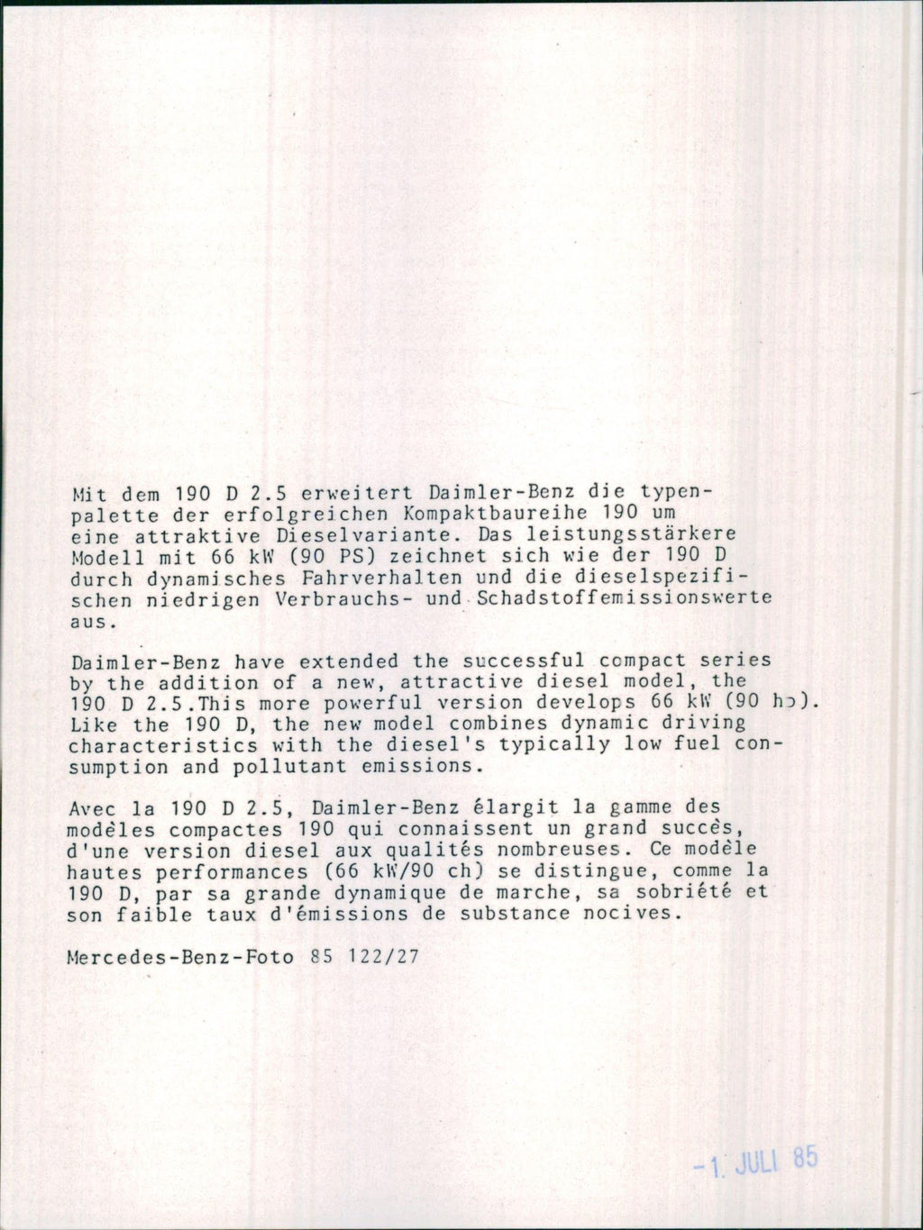 1985 Mercedes-Benz 190 D. Daimler-Benz have extended the successful compact set by the addition of a new, attractive diesel model, th 190 D 2.5.