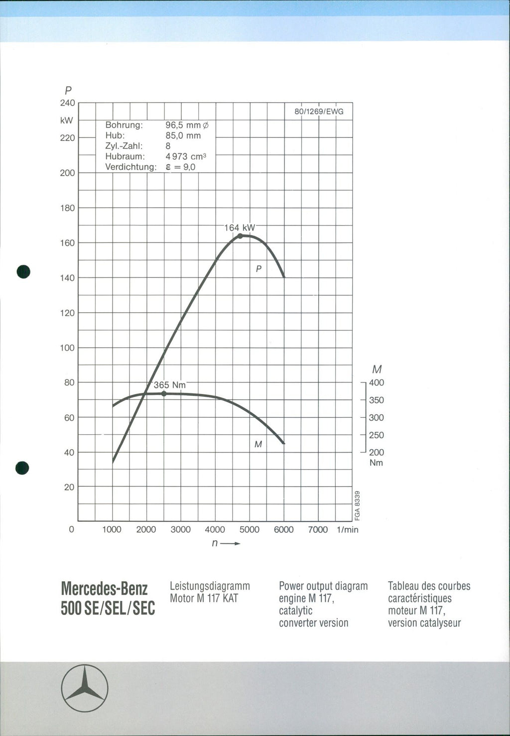 1985 Mercedes-Benz 500 SE/SEL/SEC, power output diagram engine M 117, catalytic converter version.