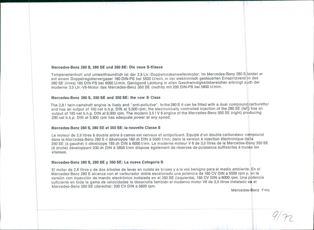 Mercedes-Benz 280 S, 280 SE and 350 SE: the new S Class The 2,8 I twin-camshaft engine is lively and "anti-pollutive". In the 280 S it can be fitted with a dual compound carburettor and has an output of 160 net b.h.p. DIN at 5,500 rpm.