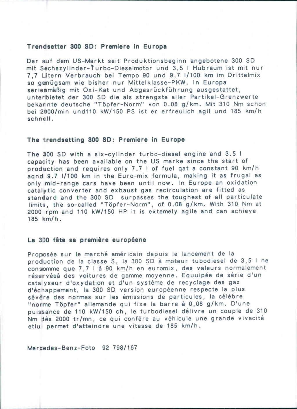 The 300 SD with a six-cylinder turbo-diesel engine and 3.5 I capacity has been available on the US market since the start of production.