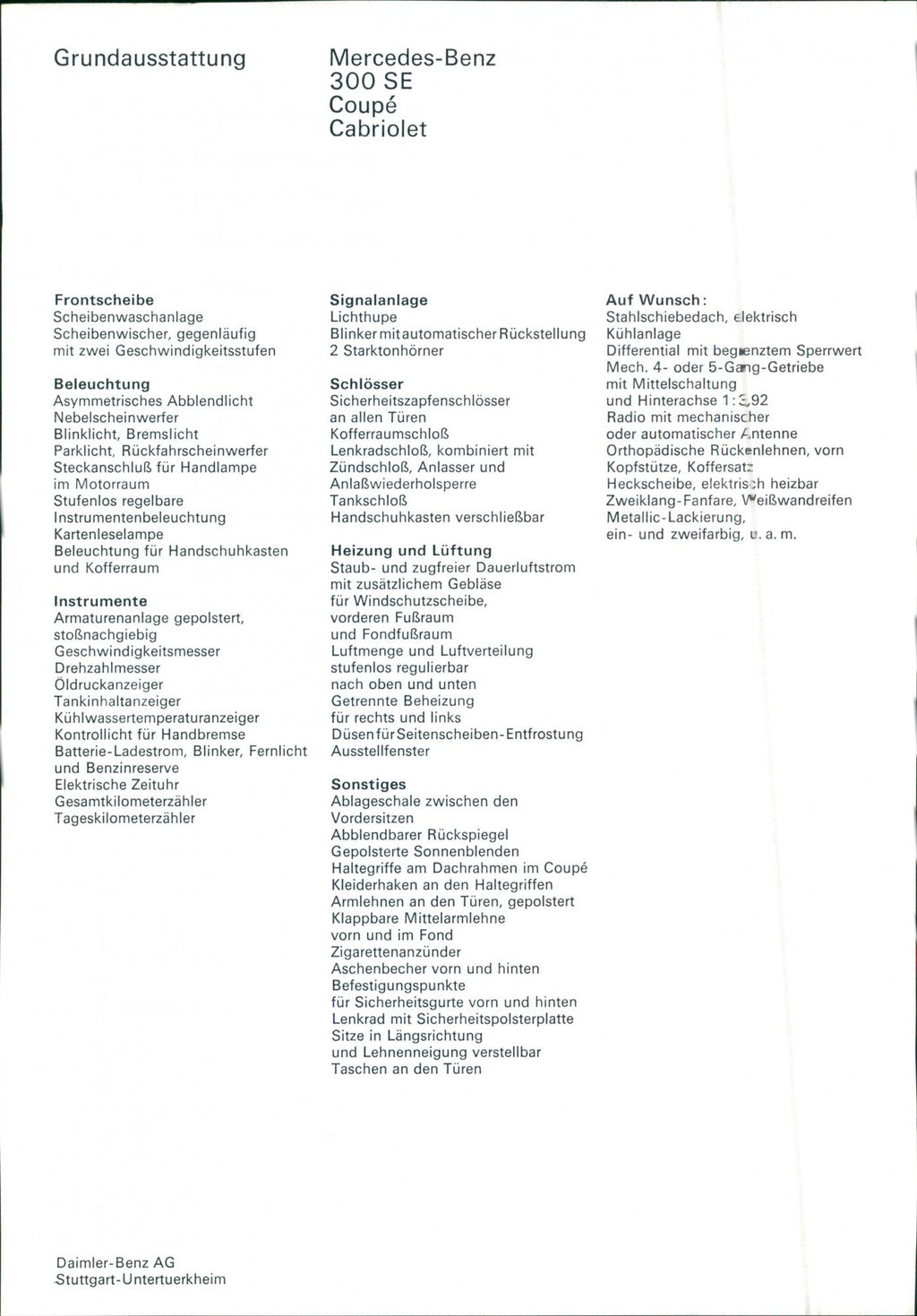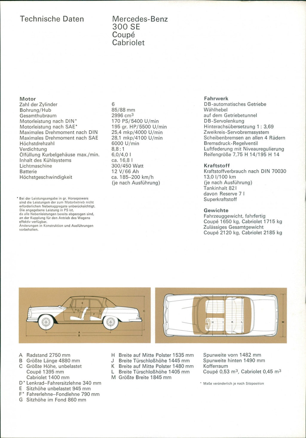 Mercedes-Benz 300 SE Coupé and Cabriolet Technical specifications and basic equipment