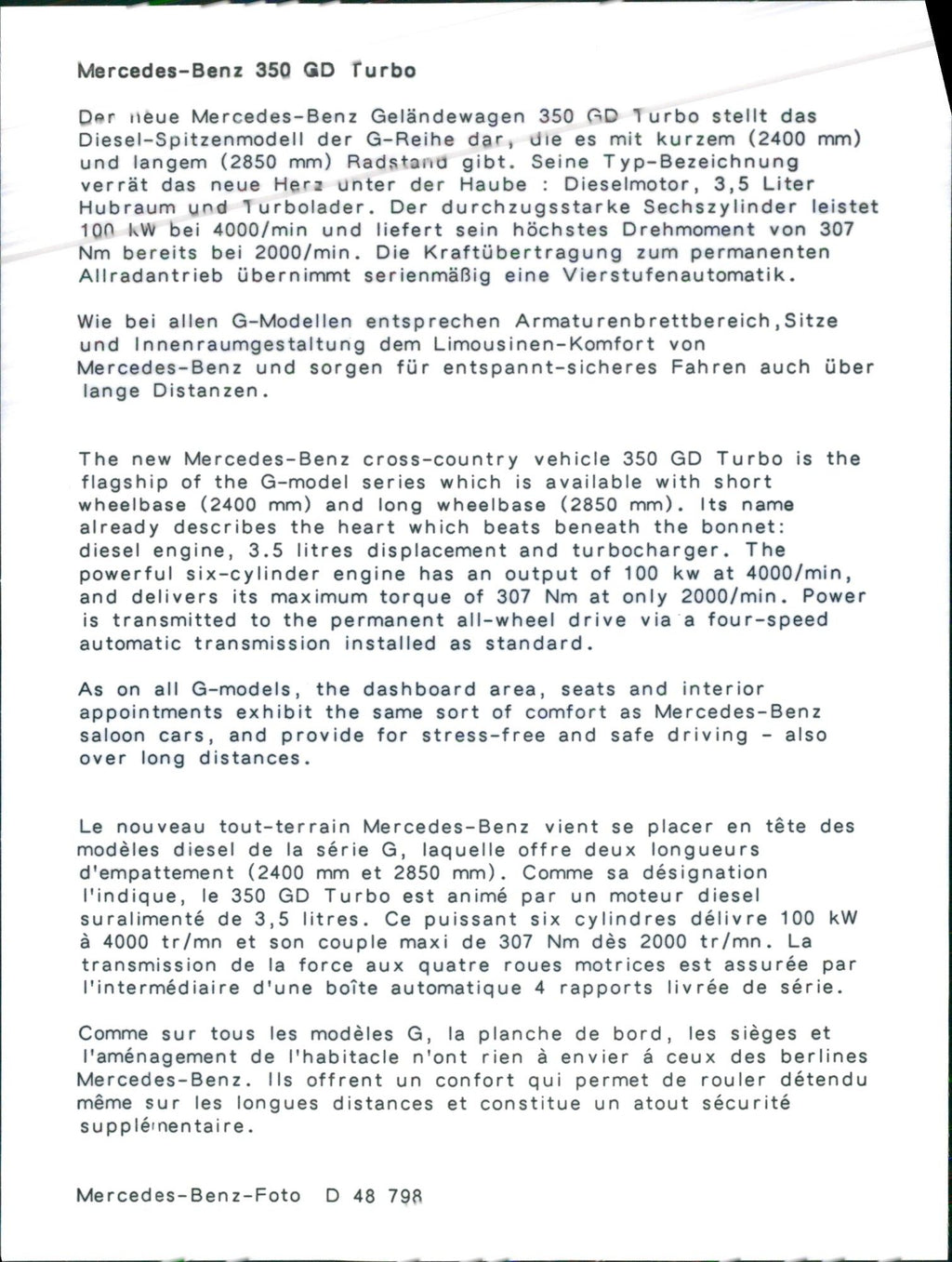 The new Mercedes-Benz cross-country vehicle 350 GD Turbo is the flagship of the G-model series which is available with short wheelbase (2400 mm) and long wheelbase (2850 mm). Its name already describes the heart which beats beneath the bonnet: diesel engine, 3.5 litres displacement and turbocharger.