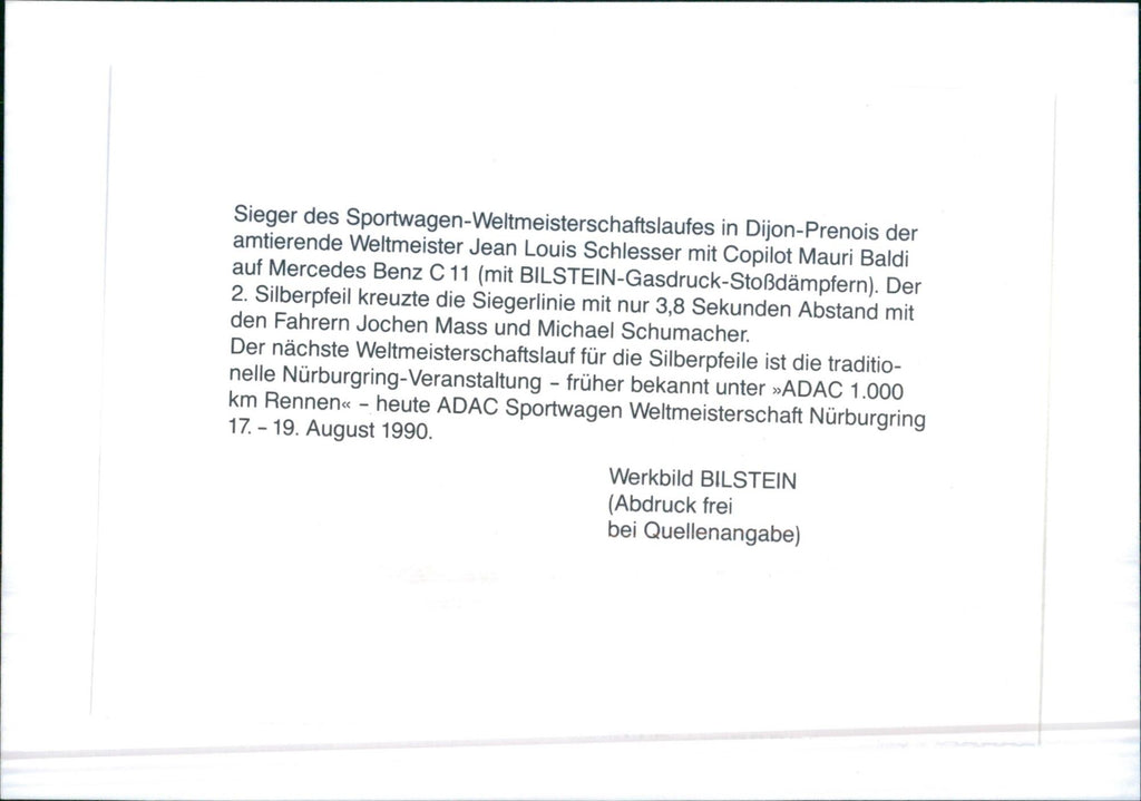 The reigning world champion Jean Louis Schlesser with co-driver Mauri Baldi in a Mercedes Benz C 11 (with BILSTEIN gas pressure shock absorbers) won the sports car world championship race in Dijon-Prenois.