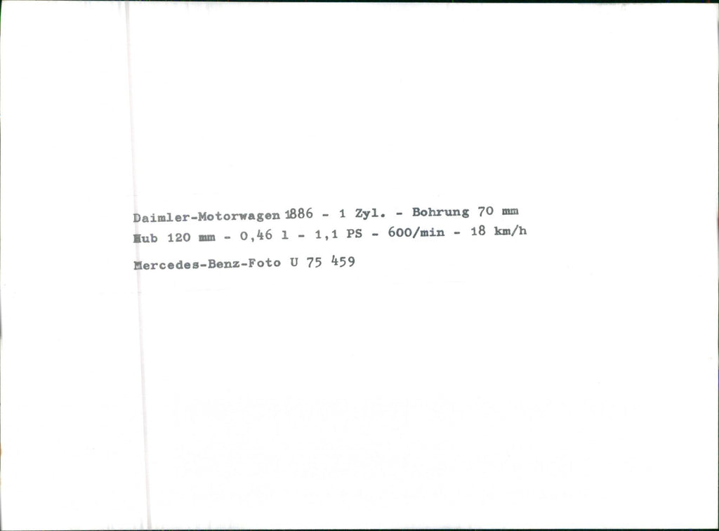 Daimler motor car 1886 - 1 cyl. Bore 70 mm stroke 120 mm - 0.46 1 1.1 HP 600 / min - 18 km / h Mercedes-Benz.