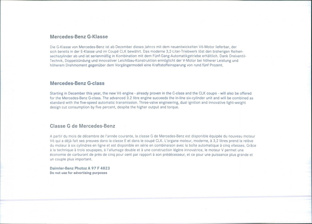 Mercedes-Benz G-class, the new V6 engine - already proven in the C-class and the CLK coupé - will also be offered for the Mercedes-Benz G-class. The advanced 3.2 litre engine succeeds the in-line six-cylinder unit and will be combined as standard with the five-speed automatic transmission.