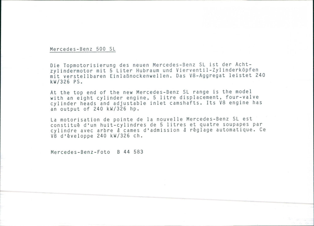 At the top end of the new Mercedes-Benz SL range is the model with an eight cylinder engine, 5 litre displacement, four-valve cylinder heads and adjustable inlet camshafts. Its V8 engine has an output of 240 kW/326 hp.