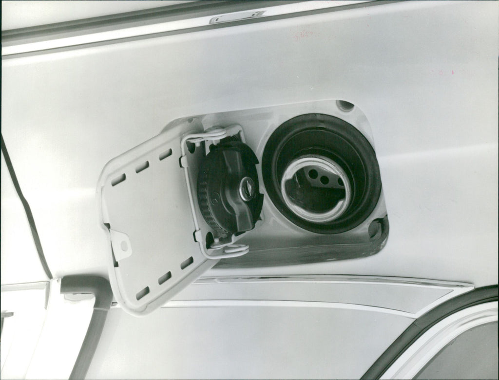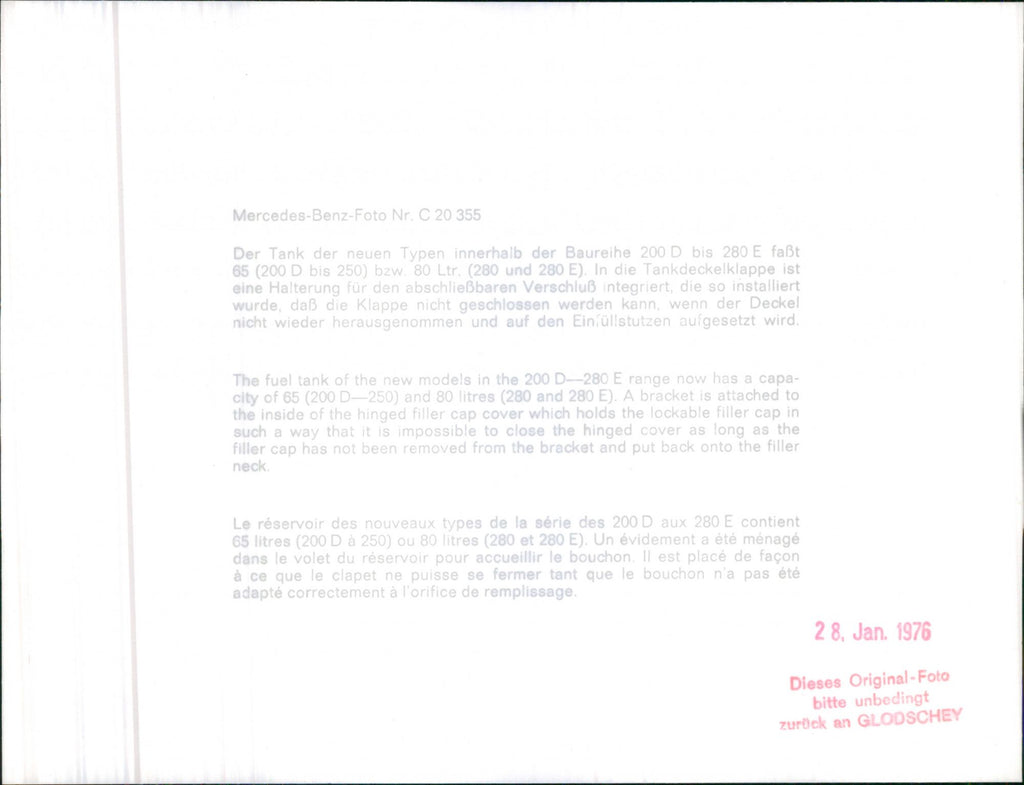 Mercedes-Benz-Foto Nr. C 20 355 Der Tank der neuen Typen innerhalb der Baureihe 200 D bis 280 E faßt 65 (200 D bis 250) bzw. 80 Ltr. (280 und 280 E). In die Tankdeckelklappe ist eine Halterung für den abschließbaren Verschluß integriert, die so installiert wurde, daß die Klappe nicht geschlossen werden kann, wenn der Deckel nicht wieder herausgenommen und auf den Ein.