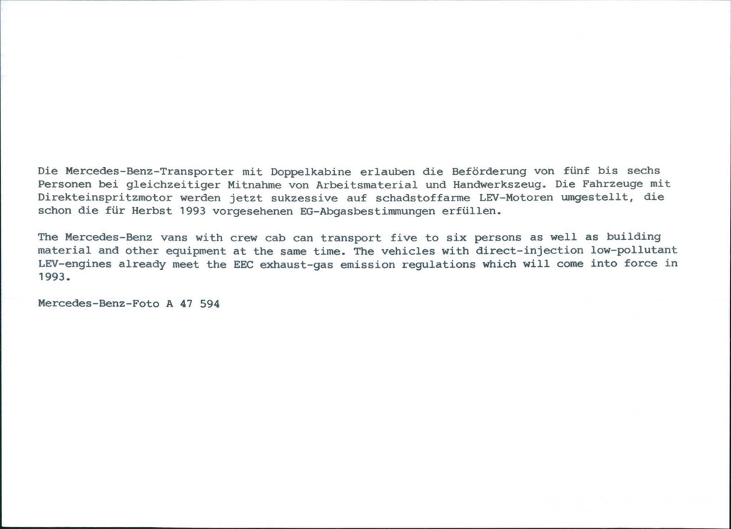 The Mercedes-Benz transporters with double cab allow the transport of five to six people while carrying work materials and tools. The vehicles with direct-injection engines are now being successively converted to low-emission LEV engines, which already meet the EG emissions regulations planned for autumn 1993.