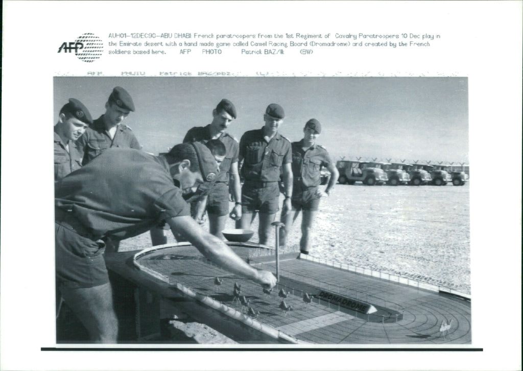 French Paratroopers from the first regiment of Cavalry Paratroopers 10 December to play in Emirate desert with a hand made game coiled Camel Racing Board. French Paratroopers from the first regiment of Cavalry Paratroopers 10 December to play in Emirate desert with a hand made game coiled Camel Racing Board.