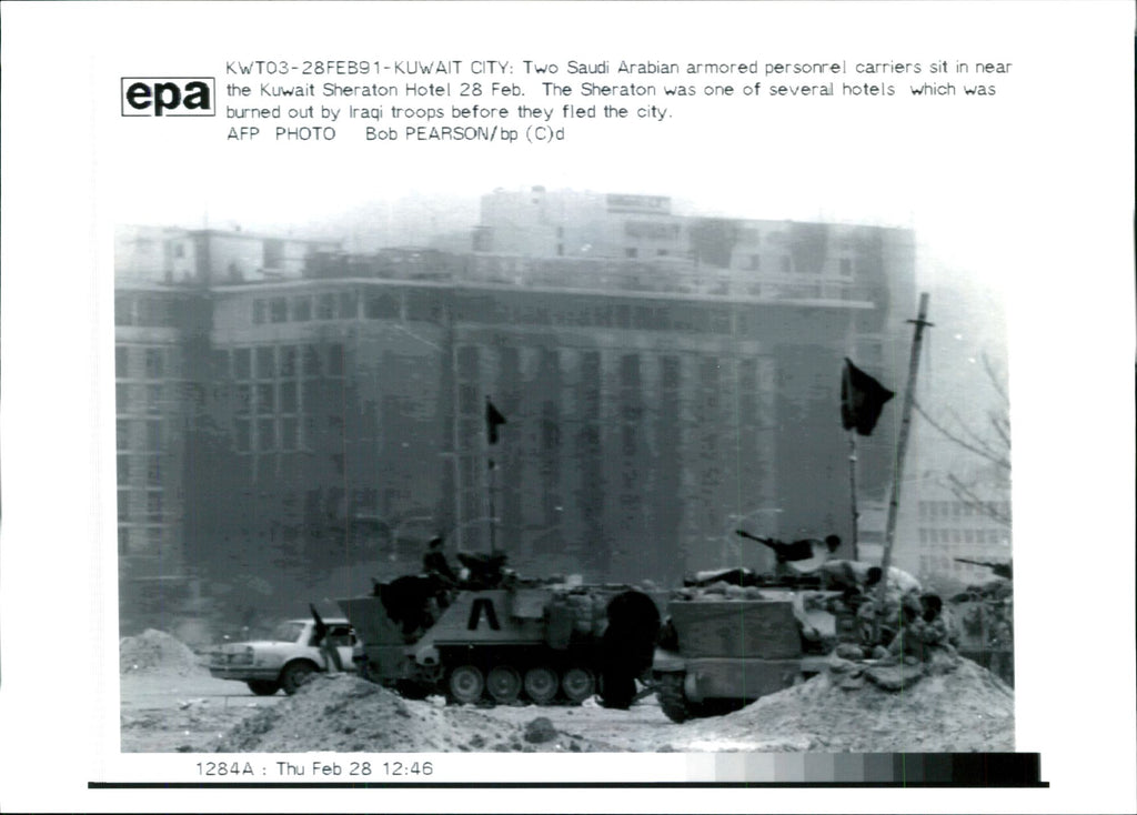 Iraq -un war kuwait city war damage:two arabian armoured personne; carries sit in near. - Vintage Photograph