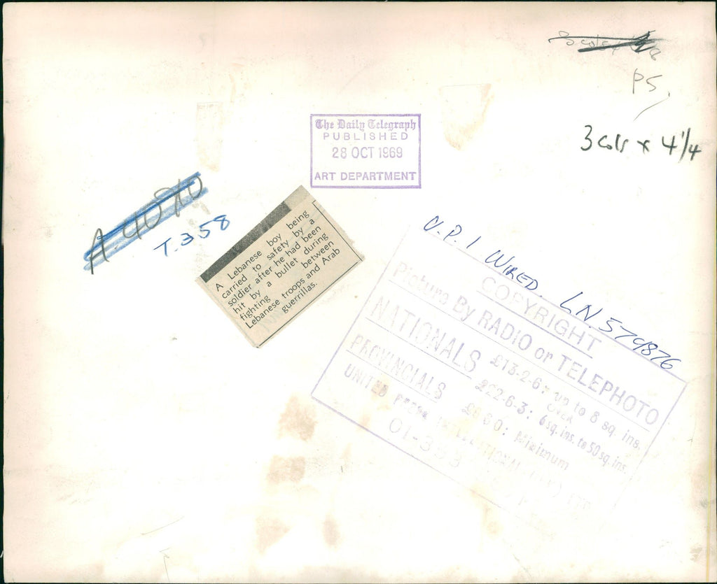 A Lebanese boy being carried to safety by a soldier after he had been hit by a bullet during fighting between Lebanese troops and Arab guerrillas. A Lebanese boy being carried to safety by a soldier after he had been hit by a bullet during fighting between Lebanese troops and Arab guerrillas.
