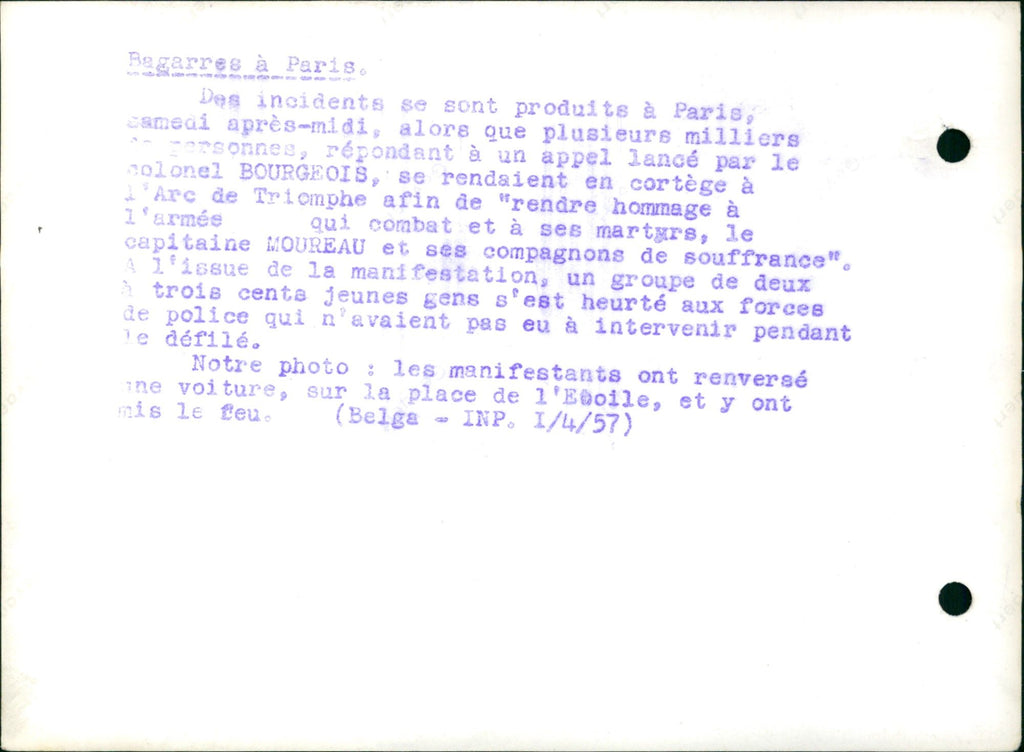 Several thousand people, responding to a call of Colonel BOURGEOIS, went to the march at the "Arc de Triomphe" to "pay tribute to the armed who fights Captain MOUREAU and his suffering companions ". It ended with two to three hundred young people collided with the police. On the photot demonstrators overturned a car on Place de l'Etoile and set it on fire.