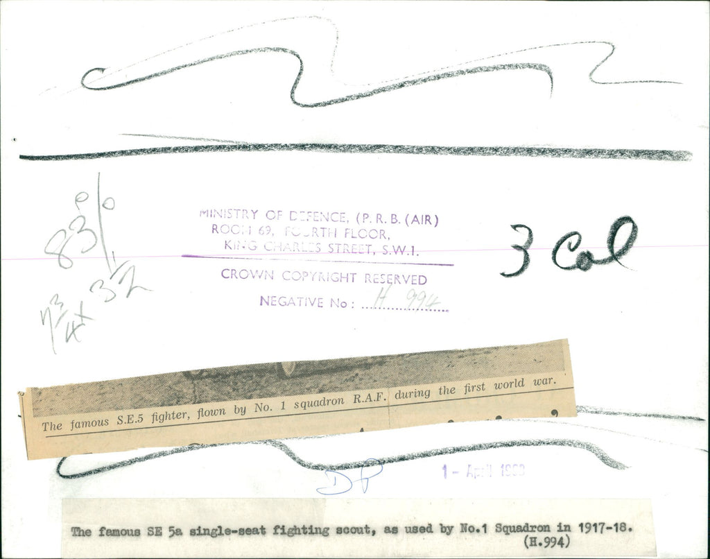 The famous S.E.5 fighter, flown by No. 1 squadron R.A.F during the first world war.