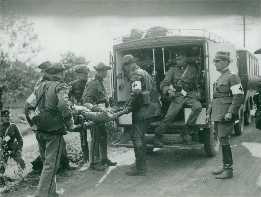 An "injured" soldier is carried aboard an ambulance during the Västgöta maneuver in 1931Field maneuver, paramedics, exercise An "injured" soldier is carried aboard an ambulance during the Västgöta maneuver in 1931Field maneuver, paramedics, exercise