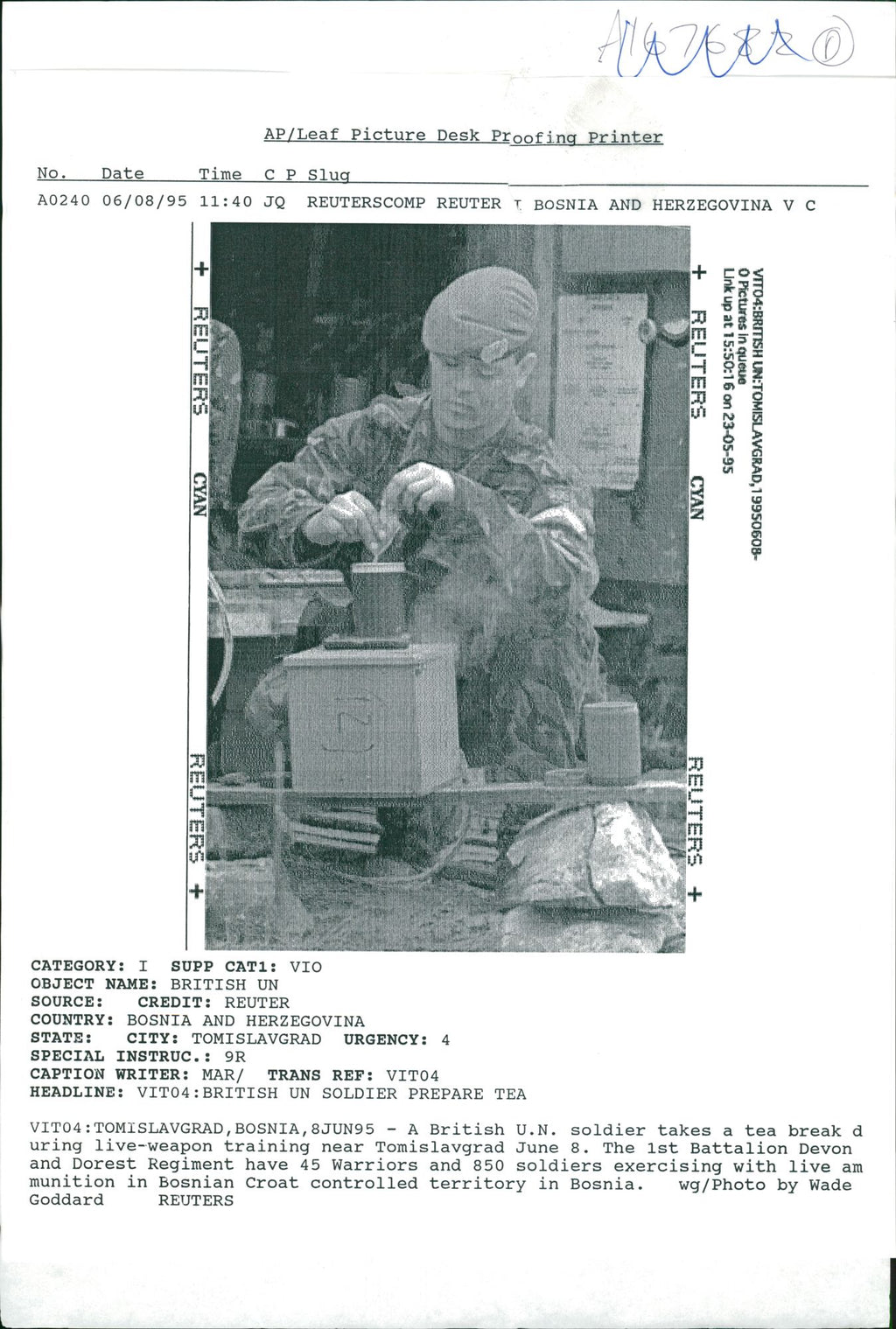 A British UN soldier takes a tea break during live-weapon training. A British UN soldier takes a tea break during live-weapon training.