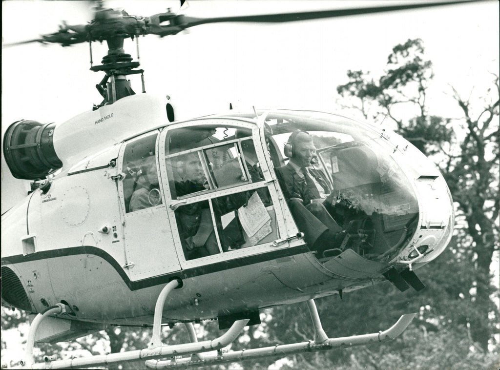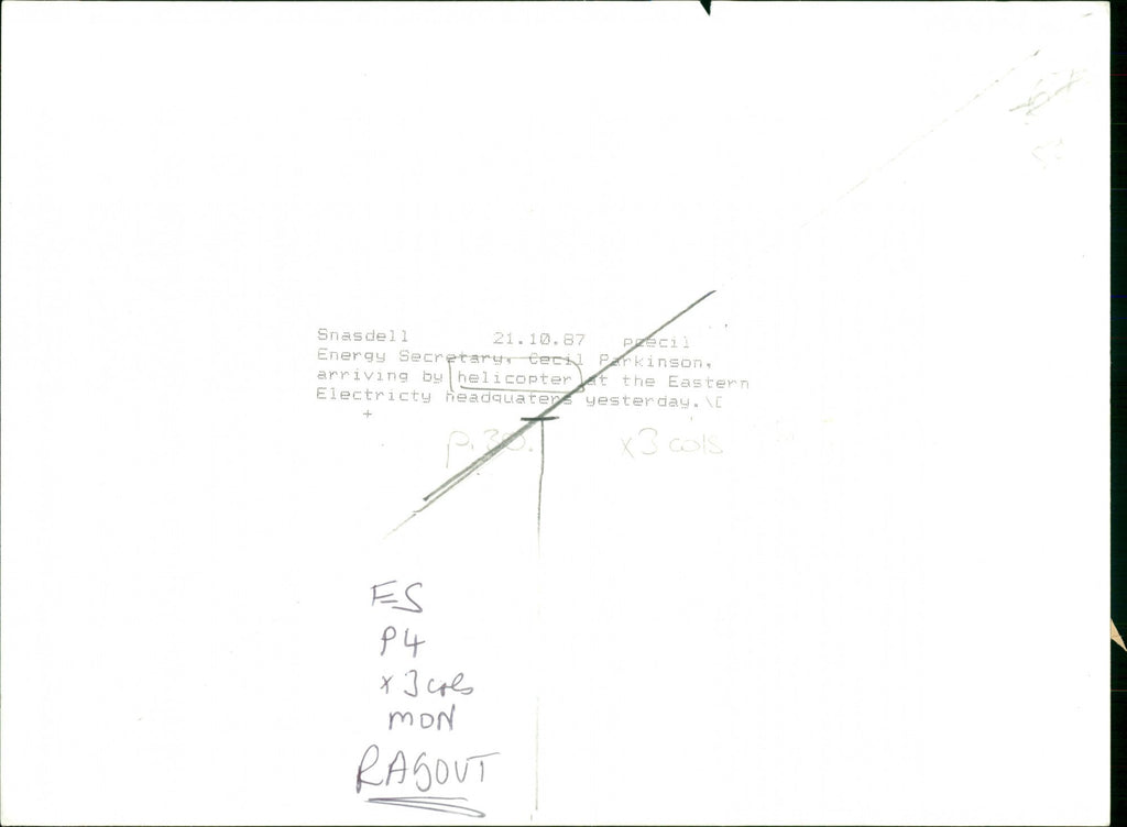 Mr. Cecil Parkinson, British Secretary of State for Energy arriving by helicopter at the Eastern Electricity headquarters.