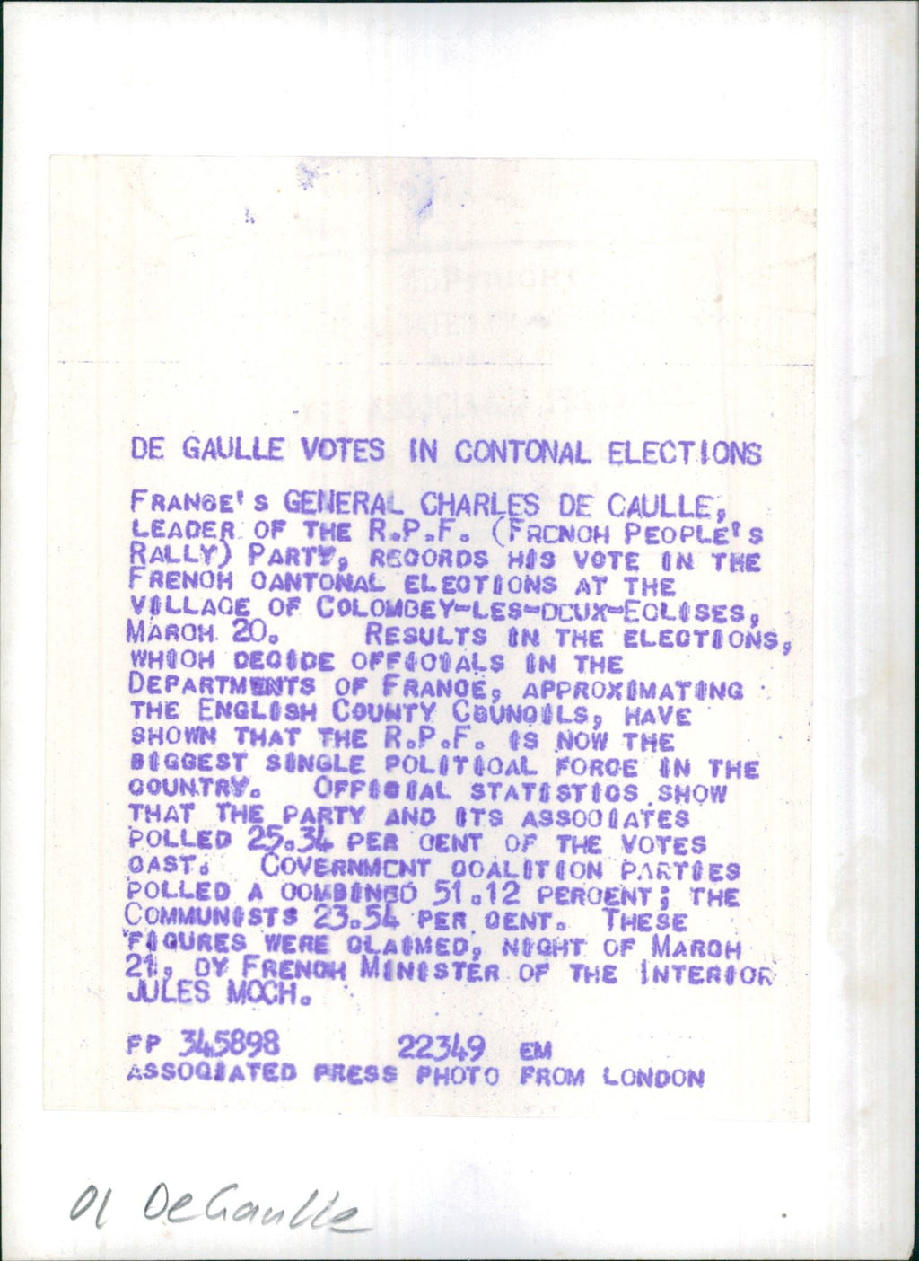 De Gaulle Votes in Cantonal Elections, France's General Charles De Gaulle, leader the R.P.F. (French People's Rally) party, records his vote in the French Cantonal Elections at the village of Colombey-Les-Deux-Eclises, March 20. Result in the elections, which decide officials in the Departments of France, approximating the English County Councils, have shown that the R.P.F. is now the biggest single political force in the country. Official statistics show that the part and its associates polled 25.34 percent of the votes cast. Government coalition parties polled a combined 51.12 percent; the communists 23.54 percent. These figures were claimed, night of March 21, by French Minister of the Interior Jules Moch.
