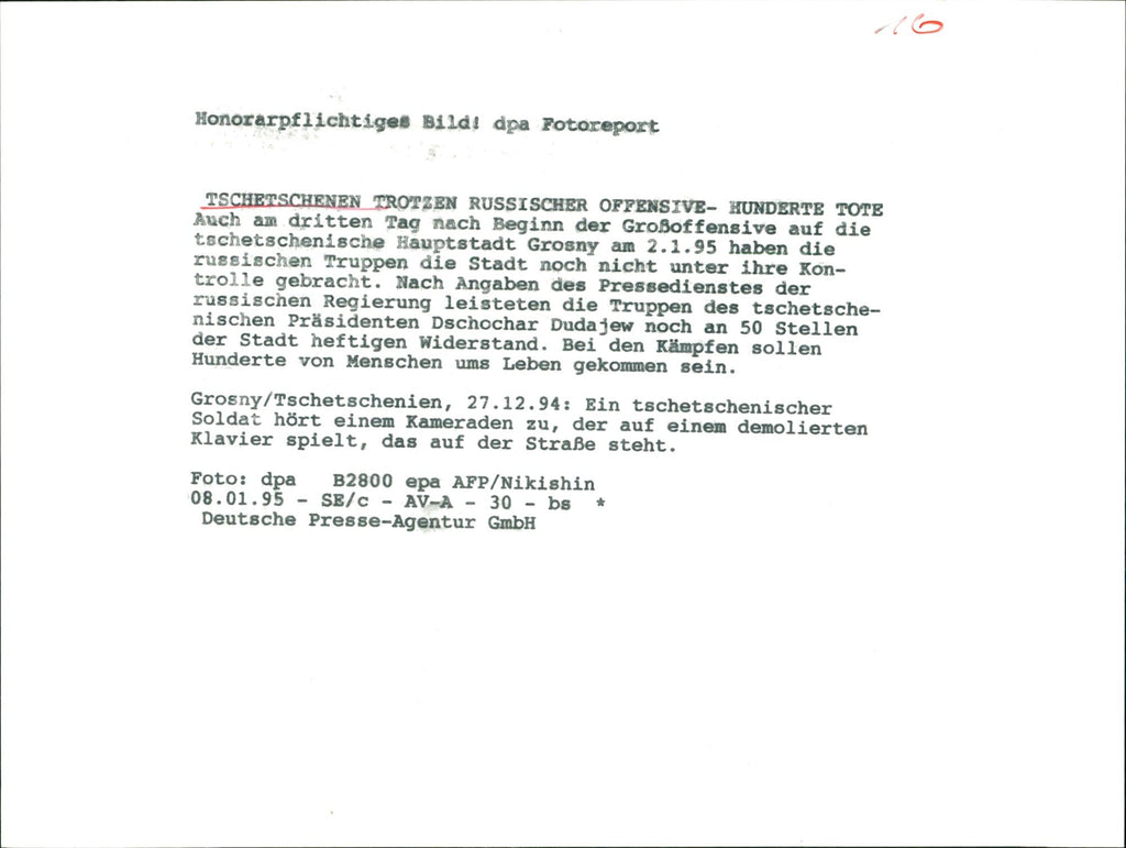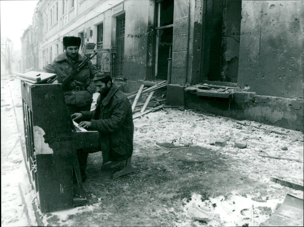 The illustration shows Chechen soldiers playing the piano in 1994.