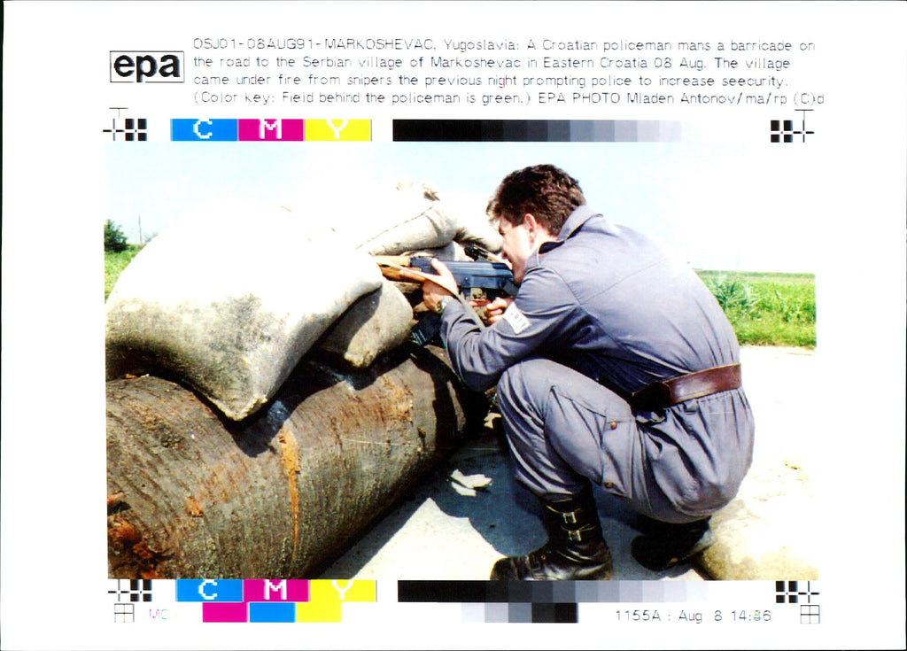 A Croatian policeman mans a barricade on the road to the Serbian village of Markoshevac in Eastern Croatia 08 Aug. The village came under fire from snipers the previous night prompting police to increase seecurity.