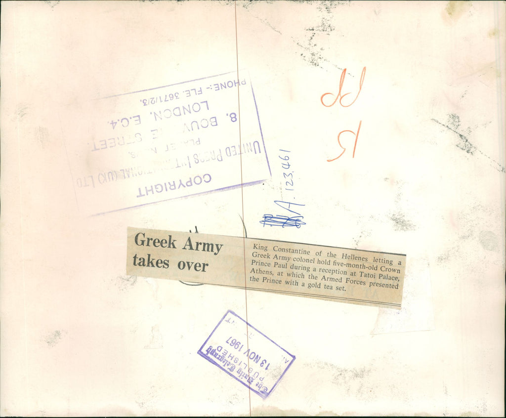 King Constantine of the Hellenes letting a Greek Army colonel hold five-month-old Crown Prince Paul during a reception at Tatoi Palace, Athens, at which the Armed Forces presented the Prince with a gold tea set. King Constantine of the Hellenes letting a Greek Army colonel hold five-month-old Crown Prince Paul during a reception at Tatoi Palace, Athens, at which the Armed Forces presented the Prince with a gold tea set.