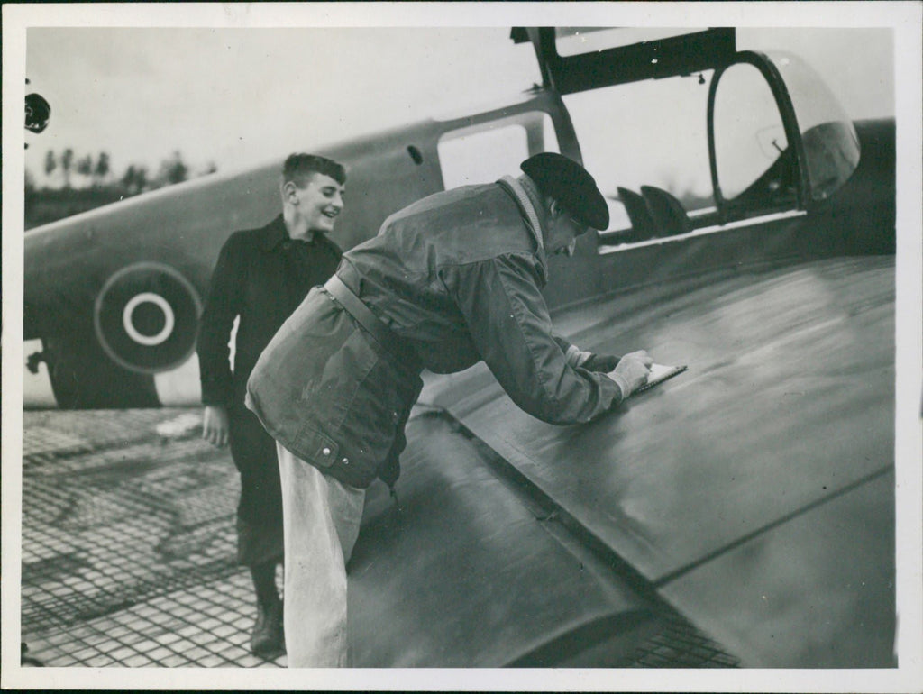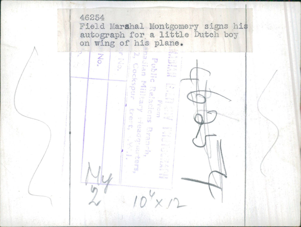 Field Marshal Montgomery signs his autograph for a little Dutch boy on wing of his plane.