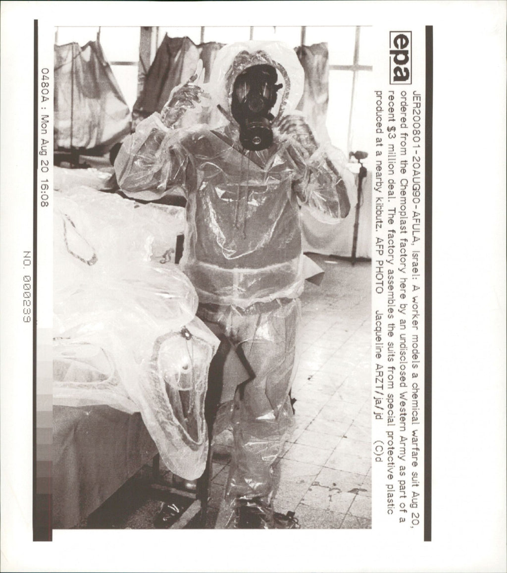 A worker models a chemical warfare suit ordered from the Chemoplast factory here by an undisclosed Western Army. Aug 20. AFP PHOTO Jacqueline Arzt. 20Aug90