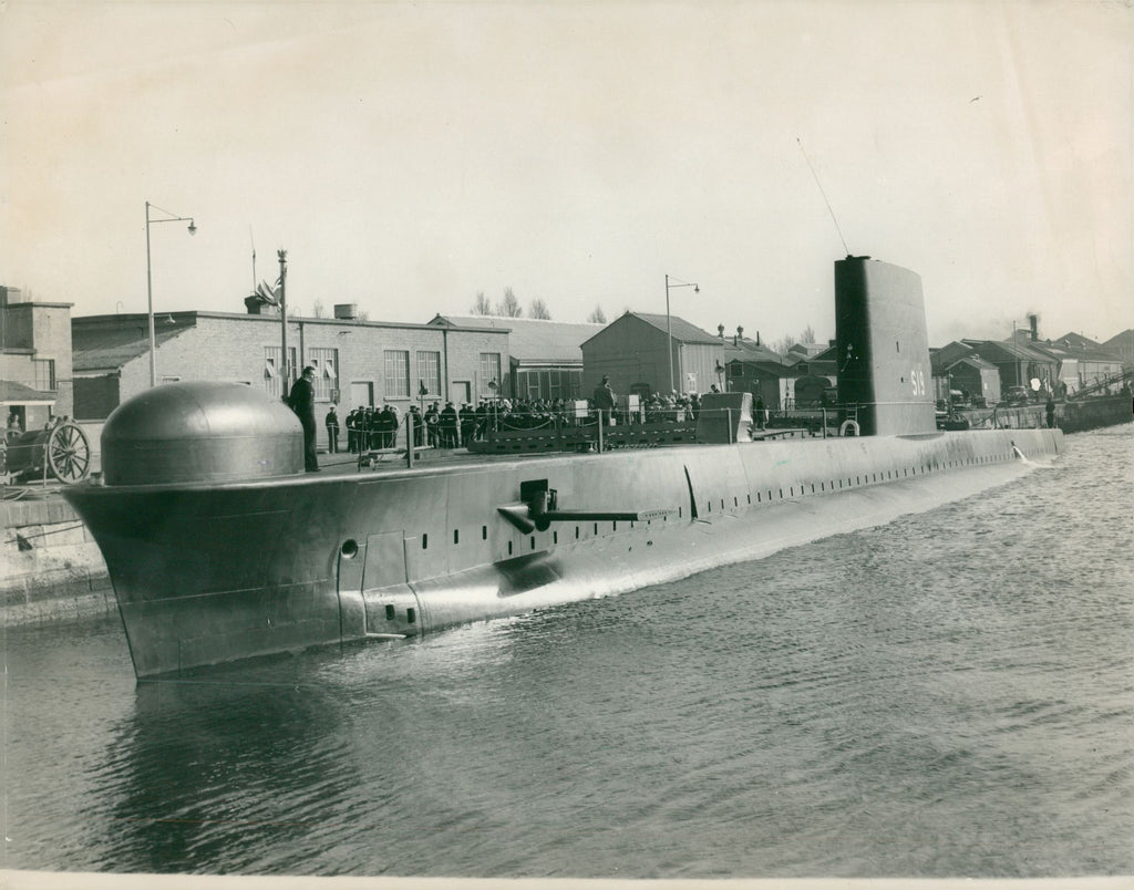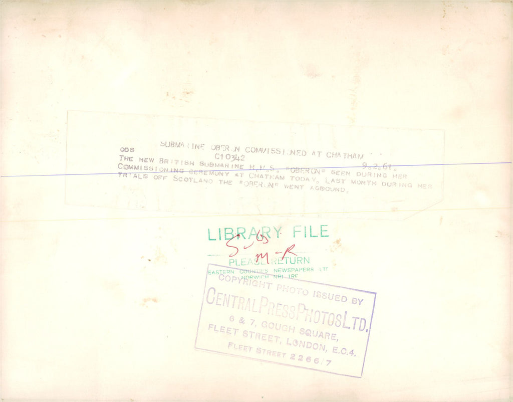 The British Submarine H.M.S. "Oberon" seen during the commissioning ceremony at Chatham.