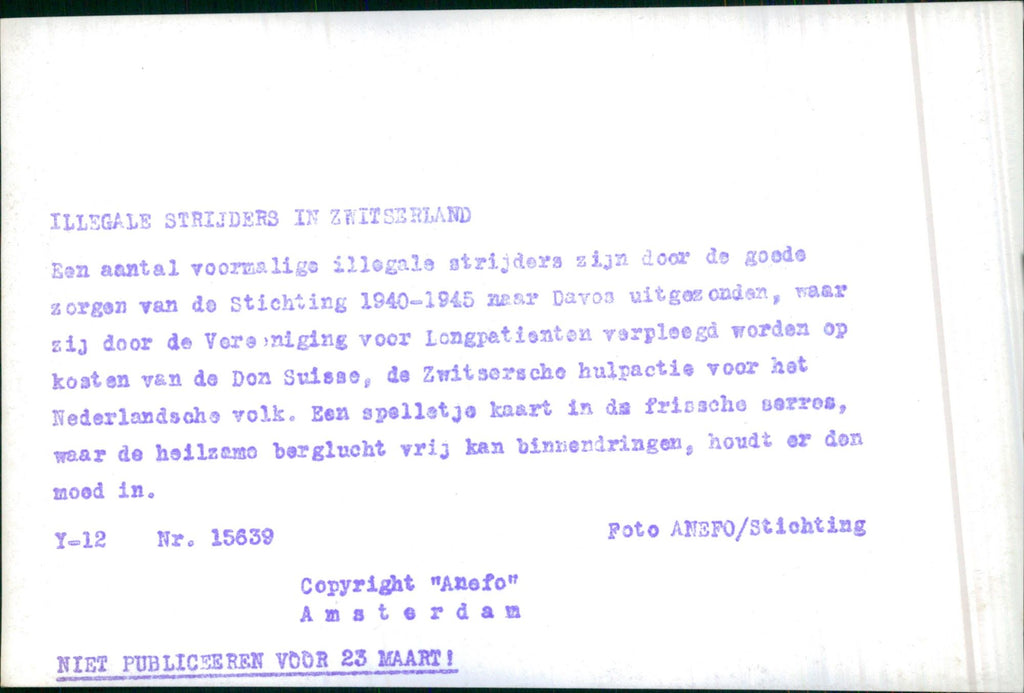 A couple of illegal fighters (sitting around tables playing card) have been sent to Davos, Switserland thanks to the good care of Stichting 1940-1945, where they will be treated by the Association of Lung-patients paid for by Don Suisse (The Swiss help-action for the Dutch population).