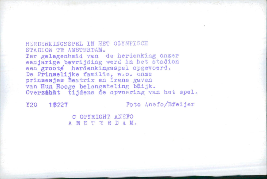 Princes Beatrix and Irene. The one year anniversary of the Dutch Liberation Day was celebrated by performing a big memorial game in the Olympic Stadium in Amsterdam, Netherlands.