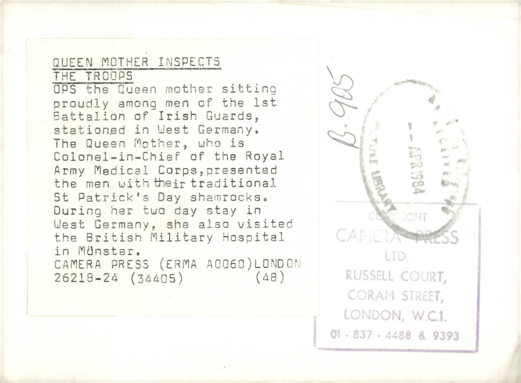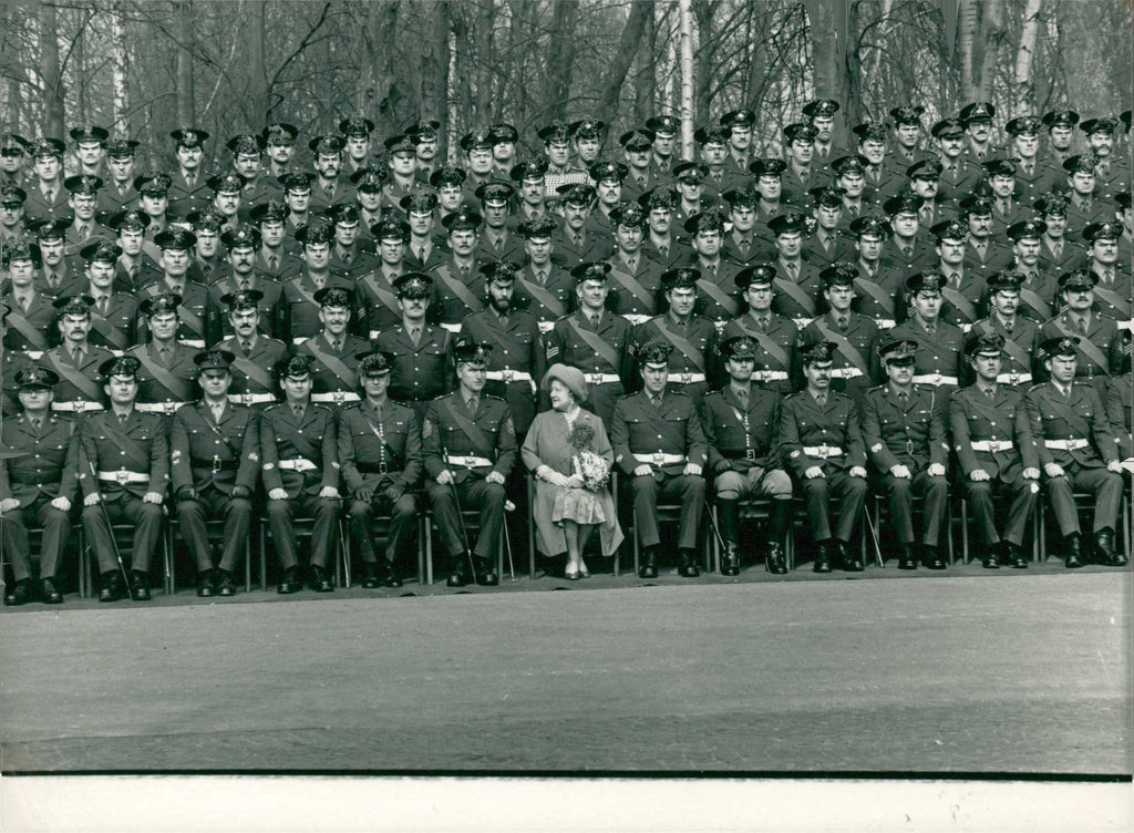 The Queen Mother sitting proudly among men of the 1st Battalion of Irish Guards , stationed in West Germany. The Queen Mother who Colonel-in-Chief of the Royal Army Medical Corps, was in Germany to inspect British troops stationed there. during her stay she presented the Irish Guards with their traditional St. Patrick's Day shamrocks and also visited the British Military Hospital in Monster. The Queen Mother sitting proudly among men of the 1st Battalion of Irish Guards , stationed in West Germany. The Queen Mother who Colonel-in-Chief of the Royal Army Medical Corps, was in Germany to inspect British troops stationed there. during her stay she presented the Irish Guards with their traditional St. Patrick's Day shamrocks and also visited the British Military Hospital in Monster.
