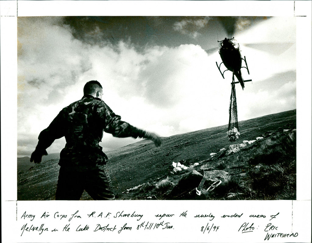 Front: Army Air Corps from R.A.F Shawbury repair the severely eroded areas of Helvellyn on the Lake District from 8th till 10th June. 8/6/94 Photo: ERIC WHITEHEAD, Back: 17 Jun 1994
