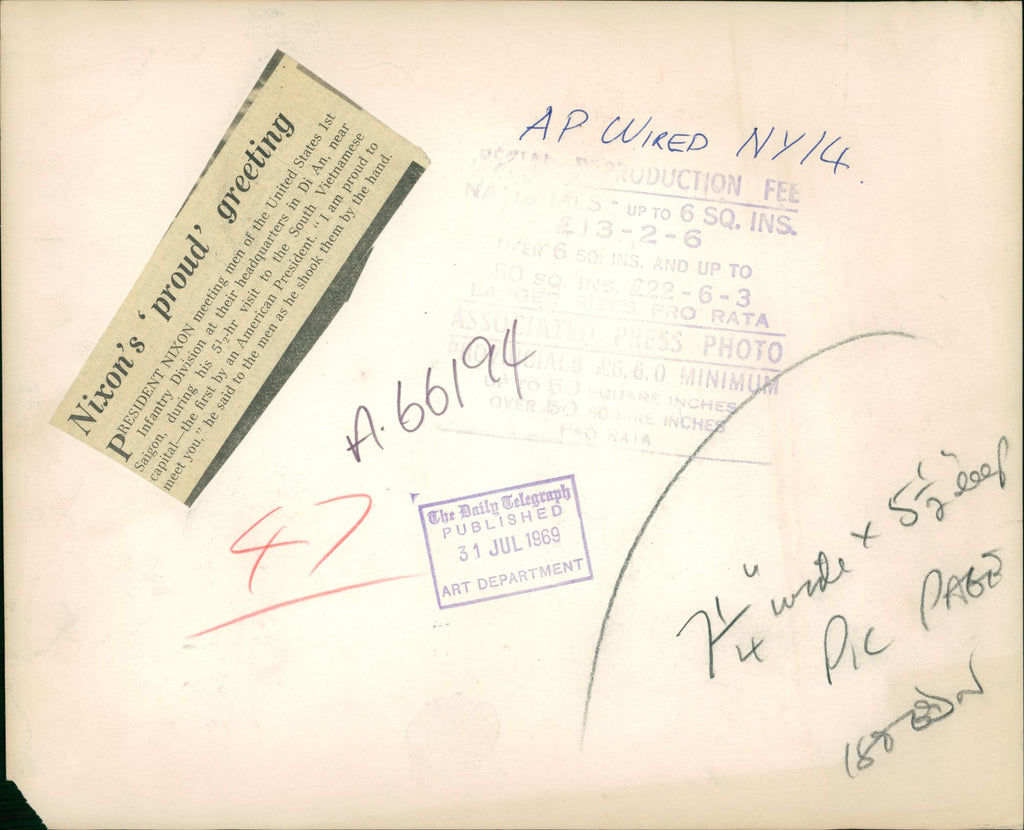 President Nixon meeting men of the United States 1st infantry Division at their headquarters in Di An, near Saigon, during his 5½-hr visit to the South Vietnamese capital the first by an American President. President Nixon meeting men of the United States 1st infantry Division at their headquarters in Di An, near Saigon, during his 5½-hr visit to the South Vietnamese capital the first by an American President.