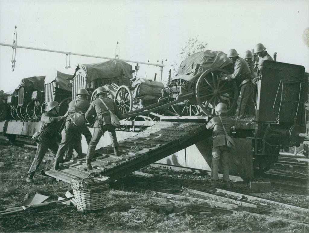 Soldiers unload wagons from the train at the autumn maneuver. - Vintage Photograph