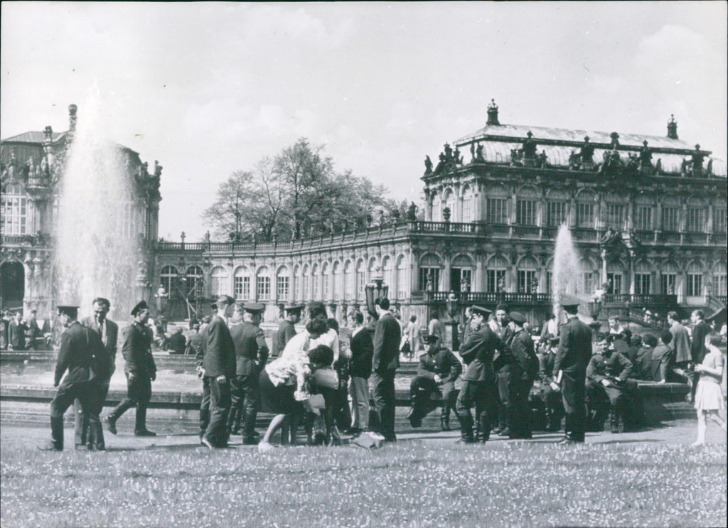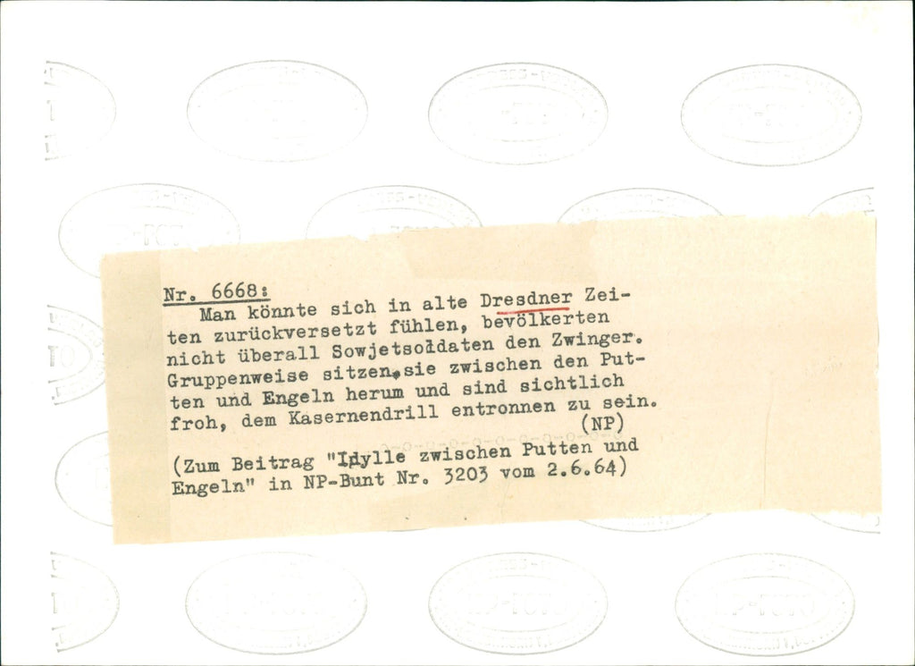 Soldiers sit distributed between putti and angels in the Dresden gardens.