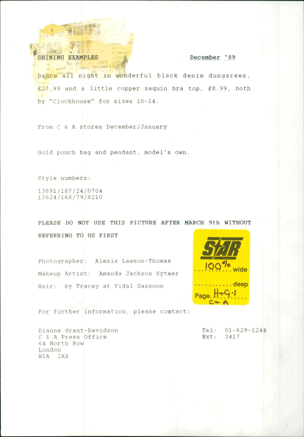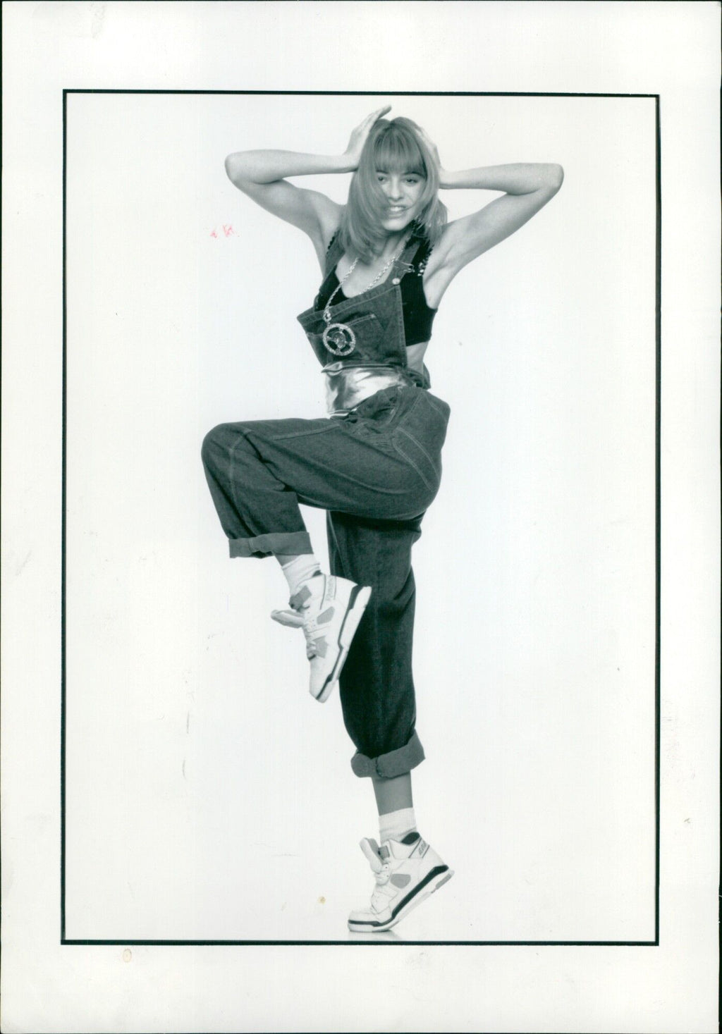 A model showcases a fashionable ensemble consisting of black denim dungarees and a copper sequin bra top. - Vintage Photograph