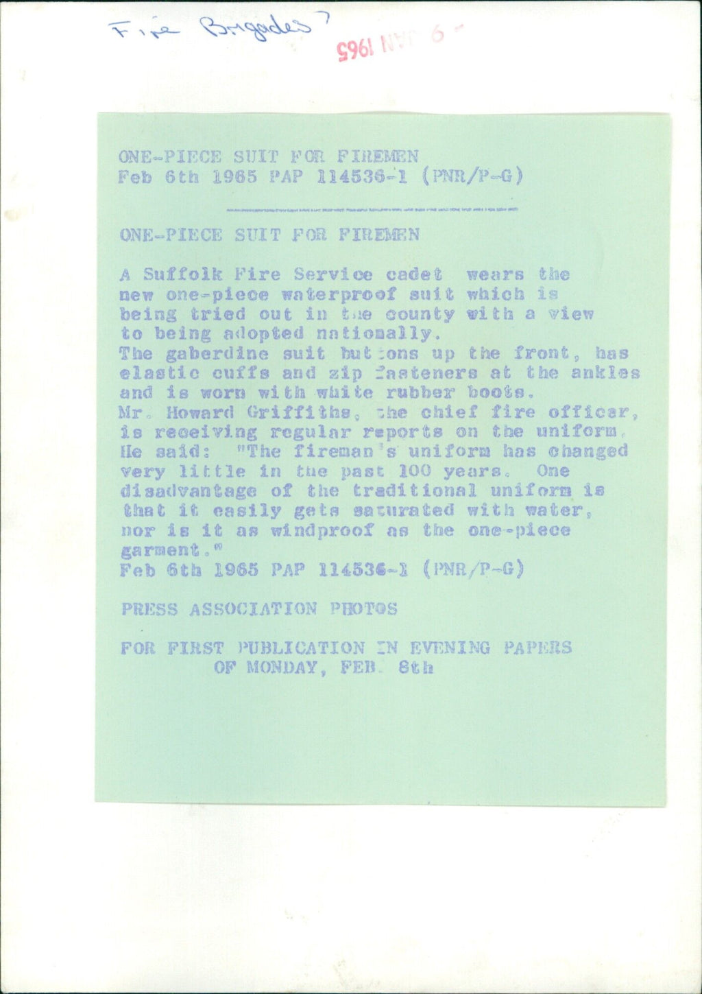 A Suffolk Fire Service cadet models the new one-piece waterproof suit being tested in the county. - Vintage Photograph