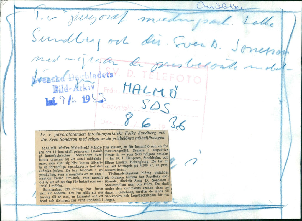 he President of the jury chair interior designer Folke Sundberg and the director Sven Sonesson with some of the award-winning furniture proposals.