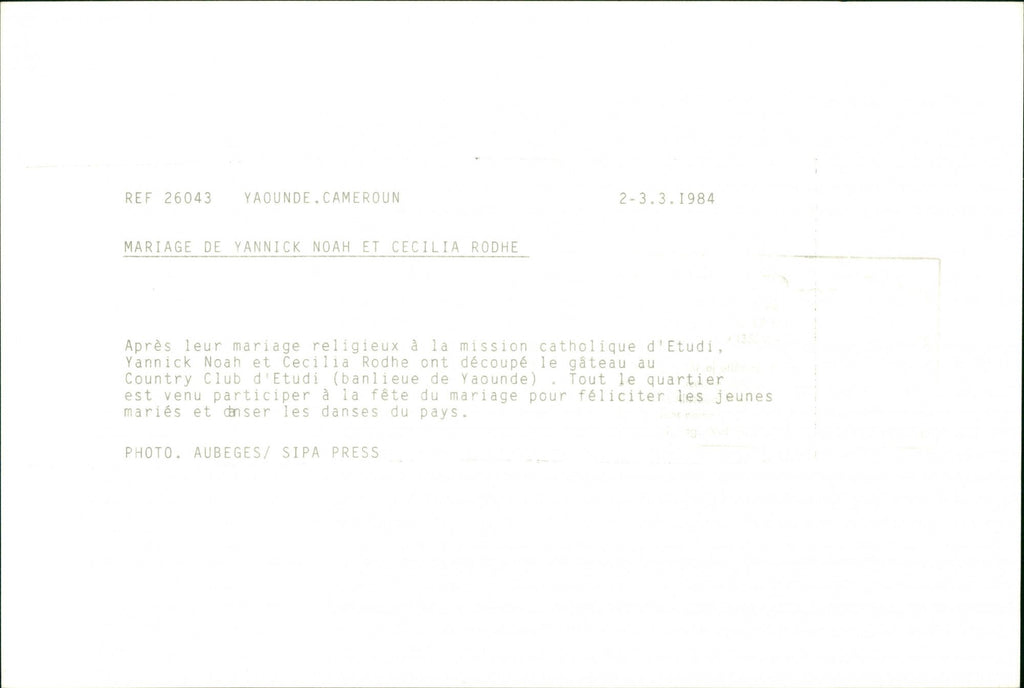 Marriage of Swedish model Cécilia Rodhe and Tennis player Yannick Noah. - Vintage Photograph