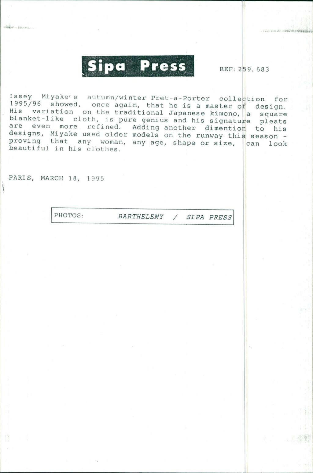 All the original vintage images are sold without watermarks. The prints are all over 30 years old and have been in the storage of the newspapers for decades. We sell them in the same conditions they were given to us by the archives.