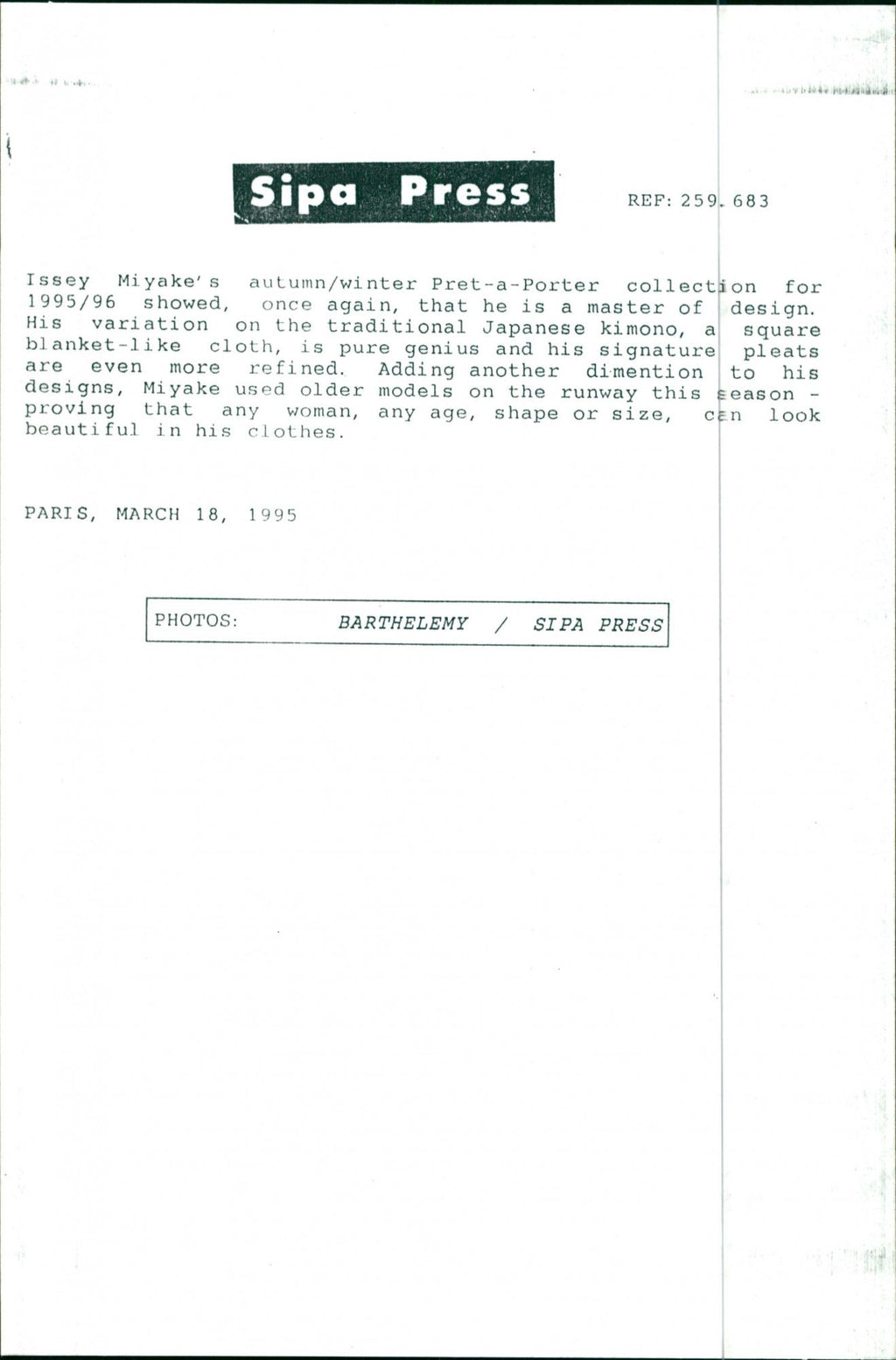 All the original vintage images are sold without watermarks. The prints are all over 30 years old and have been in the storage of the newspapers for decades. We sell them in the same conditions they were given to us by the archives.