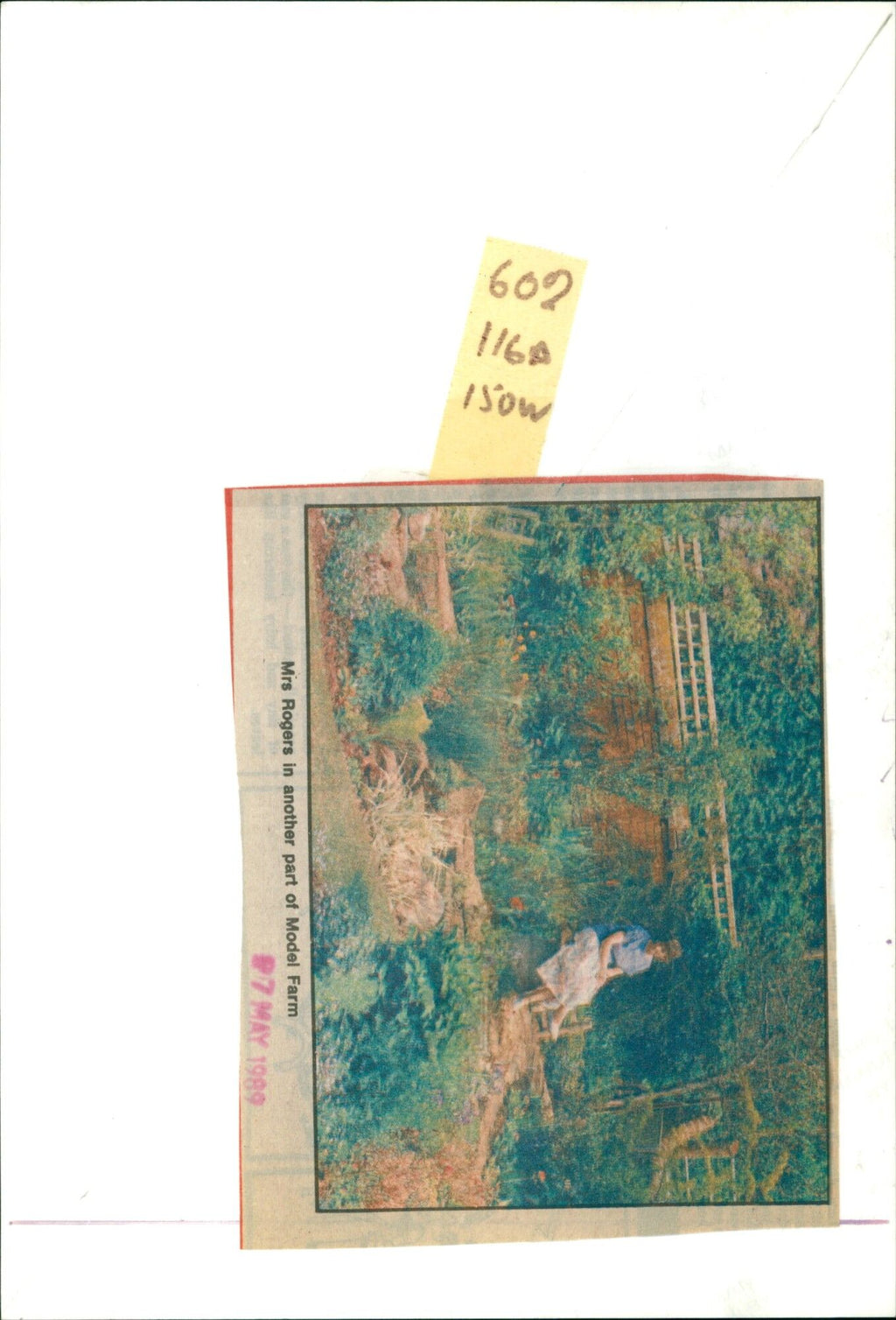 Mrs. Rogers is pictured in a rural agricultural setting, standing in a field of Model Farm #7. She is wearing an apron, suggesting she is likely involved in some form of manual labor. Mrs. Rogers is pictured in a rural agricultural setting, standing in a field of Model Farm #7. She is wearing an apron, suggesting she is likely involved in some form of manual labor.