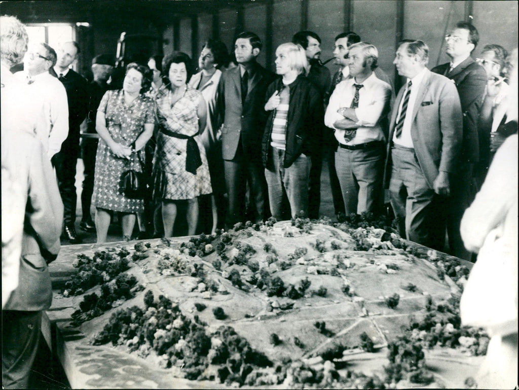 OCEDE SCERBELIN HUGELGRAVER EXCAVATIONS INN MODEL SHEAR LUNG FISSILE Gäste bei einer Präsentation am Modell des Müllbergs "Monte Scherbelino" in Frankfurt am Main.
