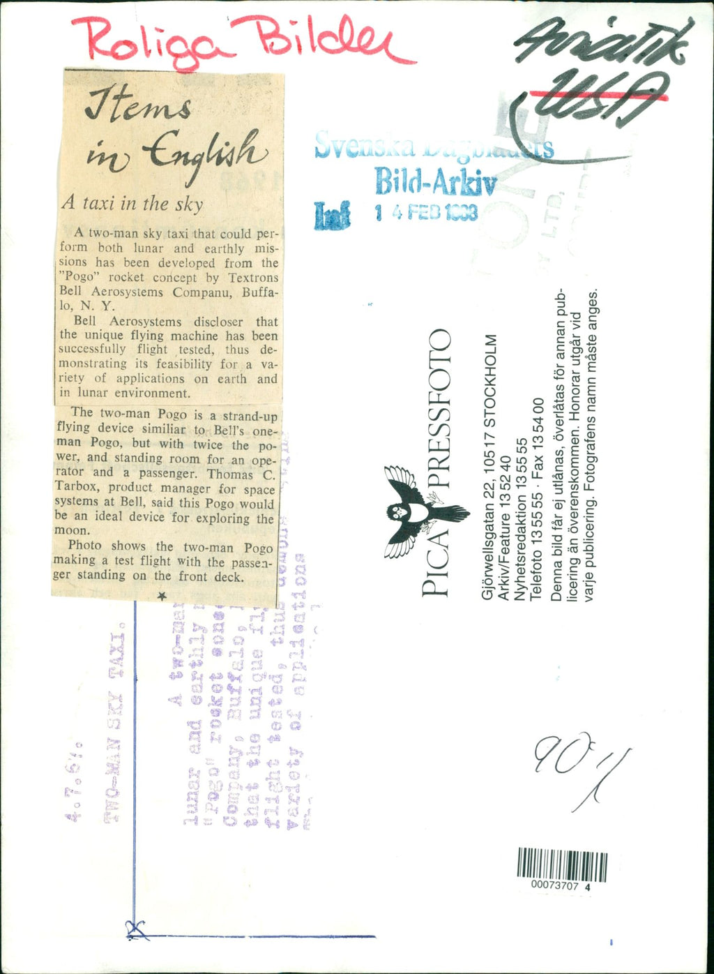 A two-man sky taxi that could perform both lunar and earthly missions has been developed from the "Pogo" rocket concept by Textrons Bell Aerosystems Company. Test flight.