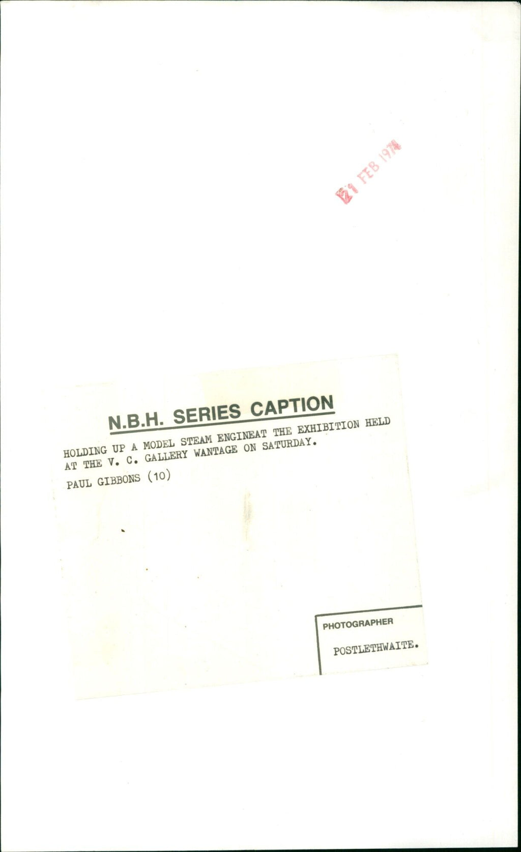 On Saturday, February 21st, 1974, Paul Gibbons (10) was photographed at the V.C. Gallery Wantage exhibition as he held up a model steam engine from the Mamod Steamera Tors N.B.H. series. On Saturday, February 21st, 1974, Paul Gibbons (10) was photographed at the V.C. Gallery Wantage exhibition as he held up a model steam engine from the Mamod Steamera Tors N.B.H. series.