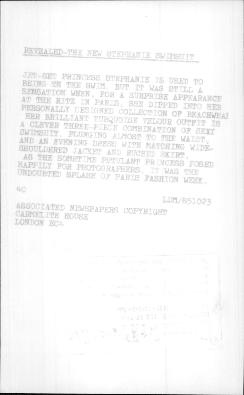 Princess Stephanie wearing her own collection during Paris Fashion Week - Vintage Photograph
