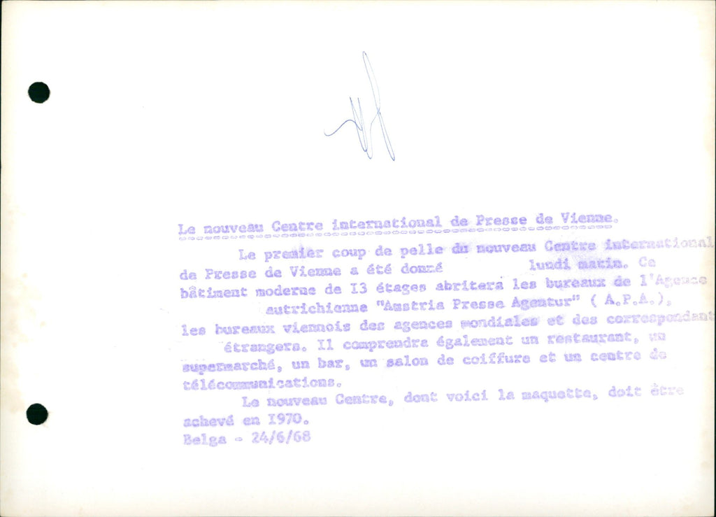 Building on the International Press Center in Vienna started . This 13-storey building will house the offices of the Austria Press Agency, world agencies and foreign correspondents. Plus a restaurant, a supermarket, a bar, a hairdressing salon and a telecommunications Center.