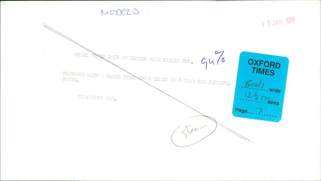 Six-year-old Jennifer Gough poses with a model high speed train at the Model Train Fair at Exeter Hall Kidlington. - Vintage Photograph