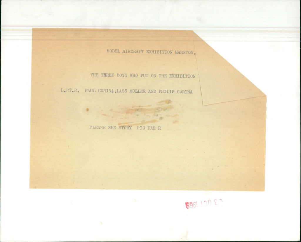 Three boys, L.RT.R. Paul Corina, Lass Moller, and Philip Corina, hosted a model aircraft exhibition at Marston. Three boys, L.RT.R. Paul Corina, Lass Moller, and Philip Corina, hosted a model aircraft exhibition at Marston.