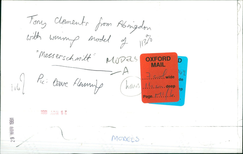 Tony Clements from Abingdon poses with a Messerschmitt plane model. - Vintage Photograph