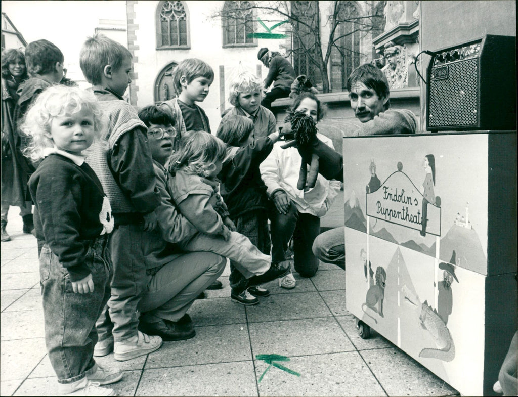 1987 THEATER PUPPETS FIGURES TROUPE CLEVE FILM Puppenspieler Dieter Brockfeld unterhält mit Kindern am Liebfrauenbrunnen.